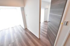 ドアを開けると正面には収納棚があり、右側にお部屋が広がっています。