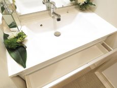 洗面化粧台は鏡の裏、引き出しと収納スペースが豊富。