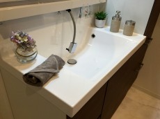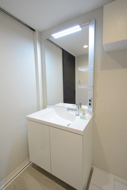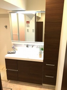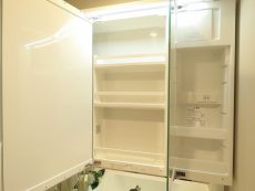 洗面台はお部屋の扉と同じトーンの木調パネルを使った大きな三面鏡付きの洗面台です。