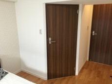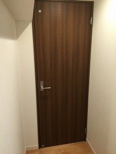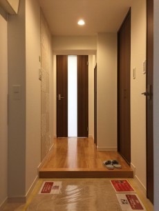廊下右方向。正面の扉の中には電気温水器がはいっています。普段は特に開けることはないでしょう。右側の扉はトイレです。