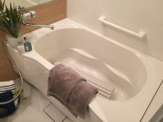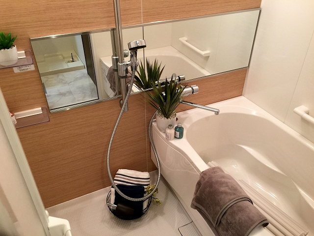 バスルームは、明るい木調パネルでリラックスできる空間です。バスタブも大きめサイズです。追炊き機能付きなので、いつでも温かい湯船に浸かれるのは嬉しいですね。