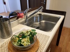 水栓はハンドシャワータイプですので、シンクのお掃除や、背の高い鍋を洗ったりに便利ですよ。