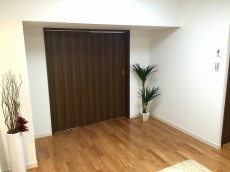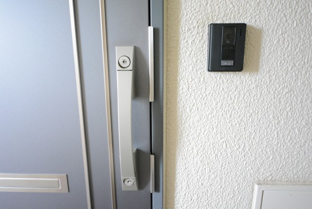 玄関前。マンションにオートロックはありませんが、お部屋にはTVモニター付きインターホンが設置されています。毎日の安心安全な暮らしをサポートしてくれますよ!ダブルロックキーでピッキング対策も◎。