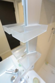 収納は洗面台の下のみになりますが、鏡横に小物入れが付いています。