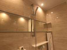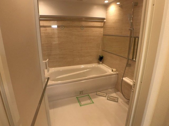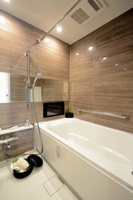 大きなミラーで浴室も広く見えますし、一日の疲れを取り、リラックスする所としてはもってこいの場に成りそうですヽ(゚▽゚*)乂(*゚▽゚)ノ