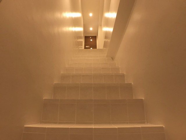 扉を開けると、上階へ続く階段が真っ直ぐ伸びています。