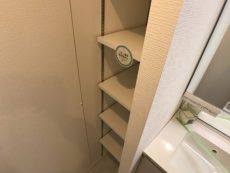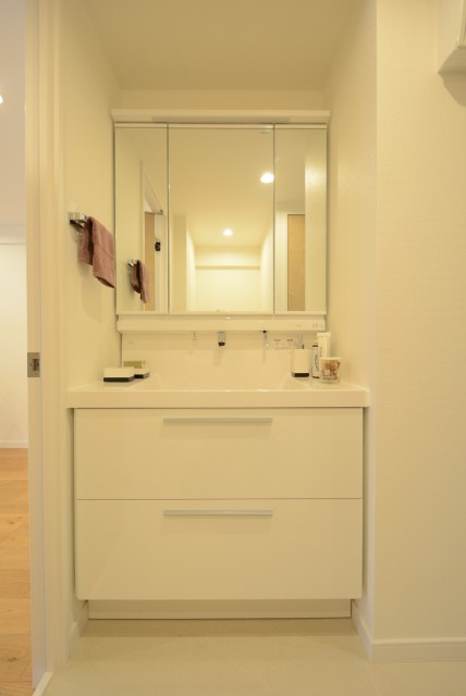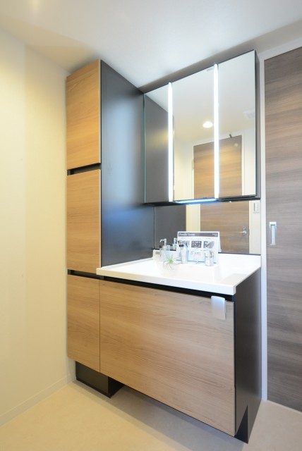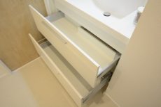 収納はミラー左側内部、洗面ボウル下、更に左手にはリネン庫も有りますね。