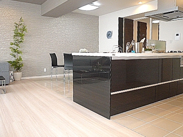 ダイニングにはタイル使い~リビングにはフローリング使いと一つの空間の中にも区別されており、お部屋作りもしやすいでしょう~