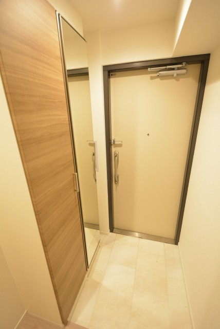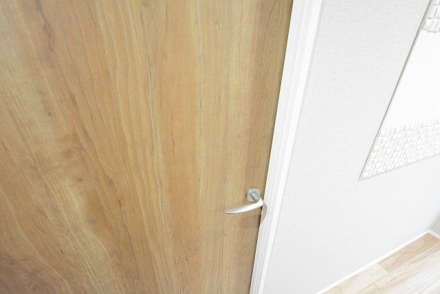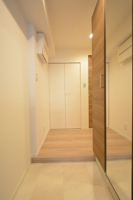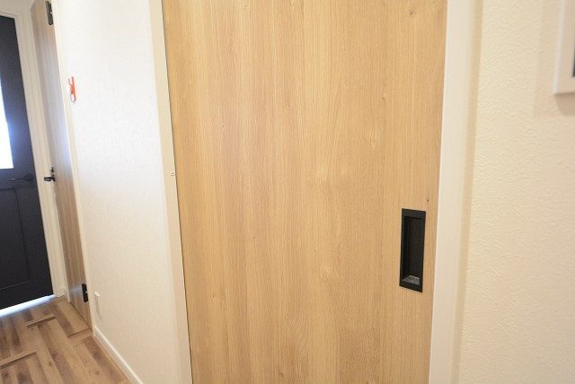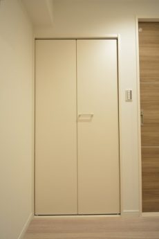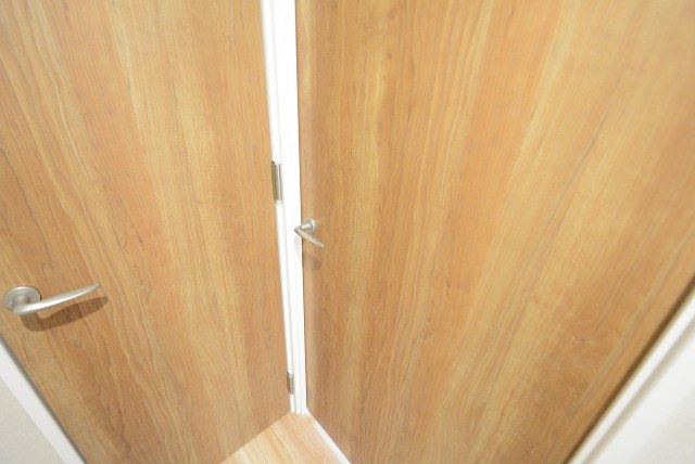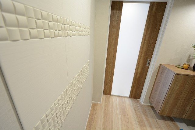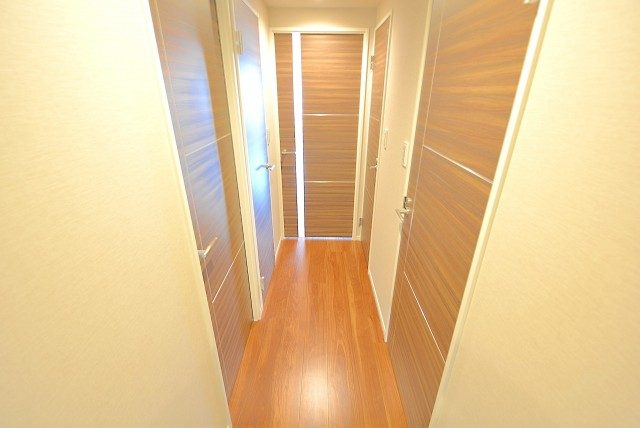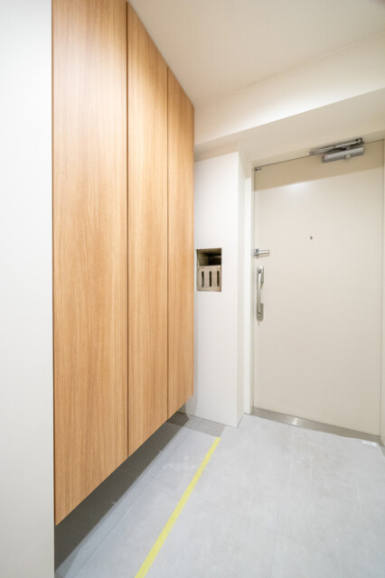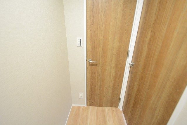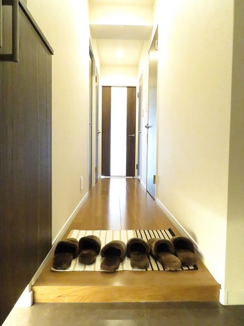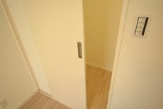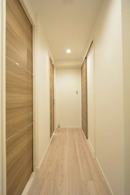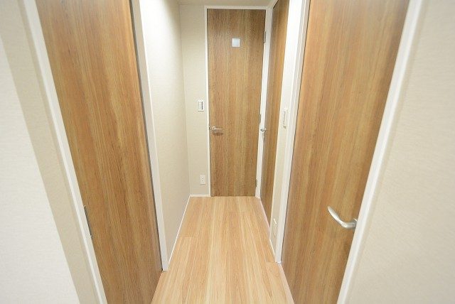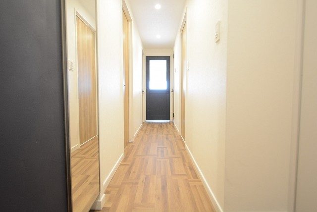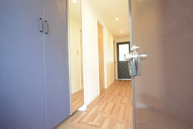 玄関ドアを開けると正面には収納の扉があり、廊下は右方向に続いていました。戸口から居室の中が見えない様な、プライバシーに配慮された造りになっています。