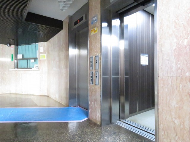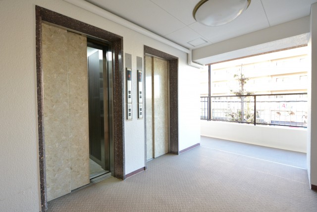 エントランスを入ると正面に管理室があり、並びにエレベーターが2基あります。