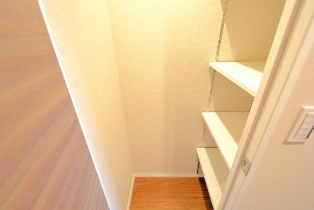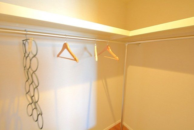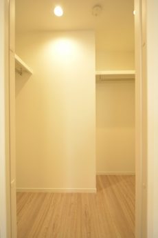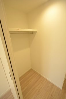 突き当りの収納は、棚などが無い自由に使えるタイプです。そのまま大きな物を入れたり、シェルフを置いたり、ハンガーポールを設置すればクローゼットとしても使えそうです。