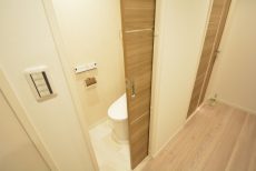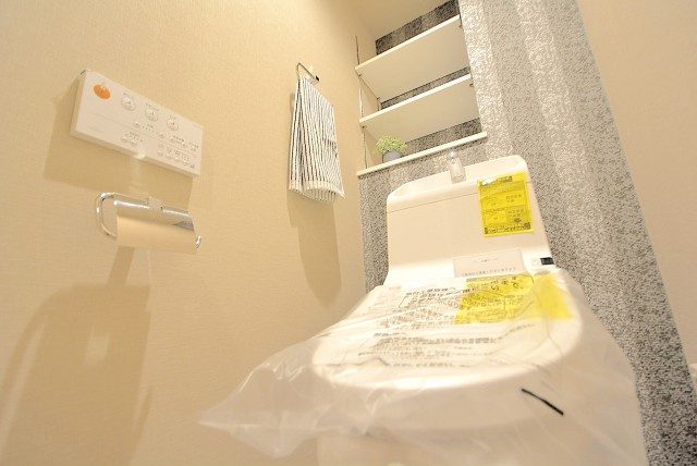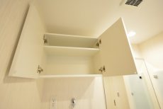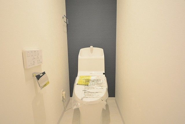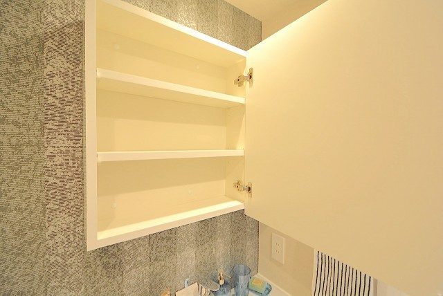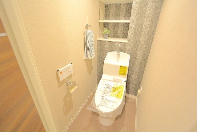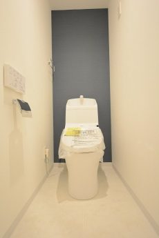 ウォシュレット付トイレです。上の部分には白い吊戸棚があります。白を基調としているトイレのクロスと白い扉の吊戸棚は一体化にみえ圧迫感は感じませんでした。