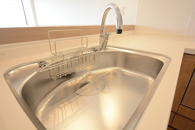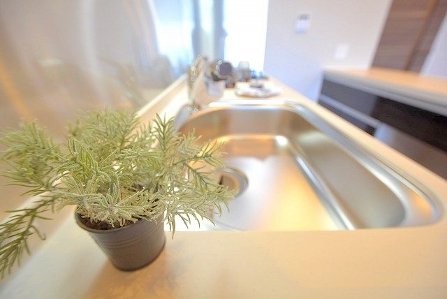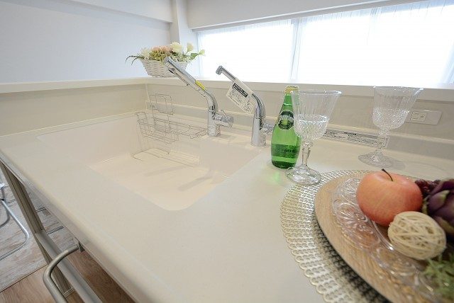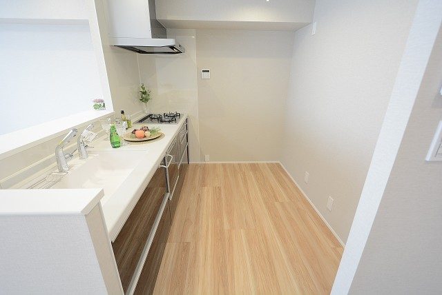 白を基調としたL字型のキッチンは清潔感ある使い勝手が良さそうなキッチンです。
