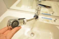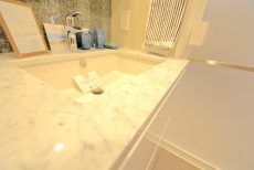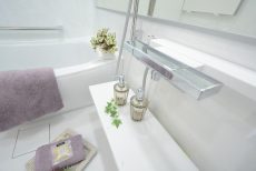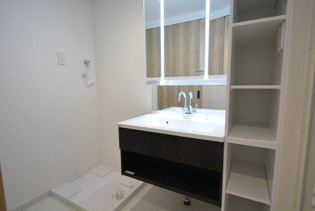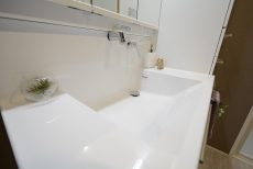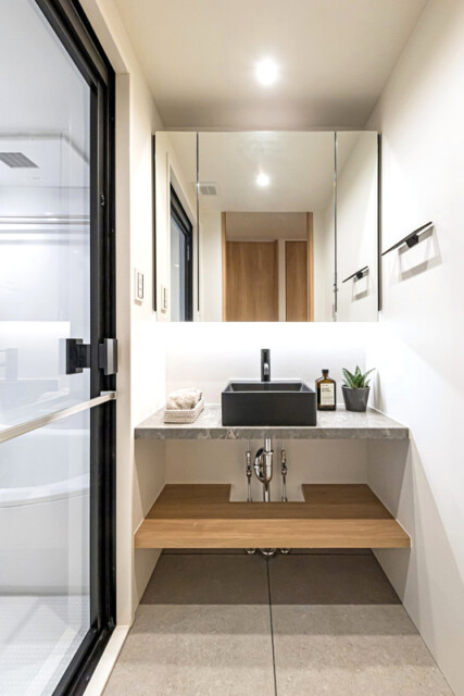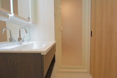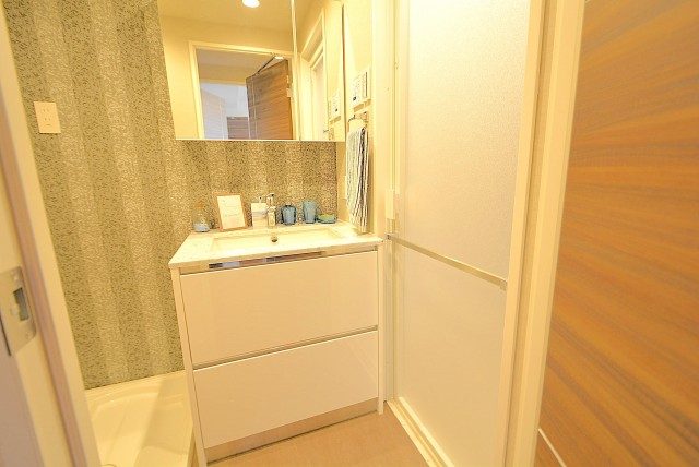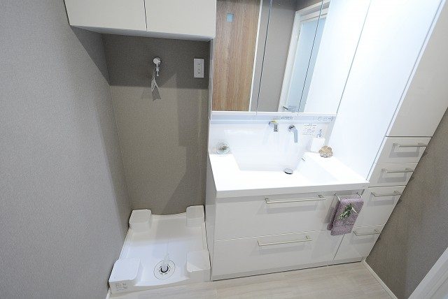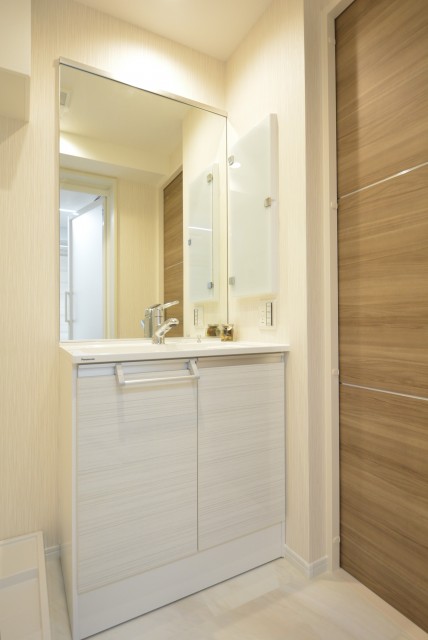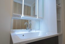 洗面室には洗面化粧台の他に浴室があって脱衣スペースも兼ねています。まるでホテルのような洗面化粧台は身だしなみを整えるのに便利な三面鏡付き。裏がキャビネットになっているので洗面周り特有の細々としたものもスッキリと収納可能です。
