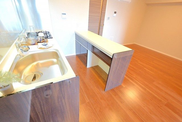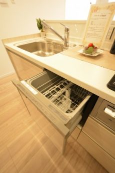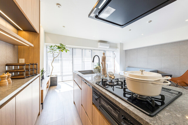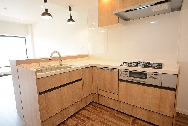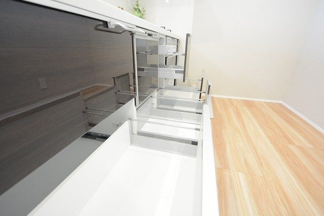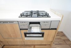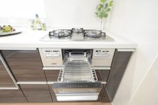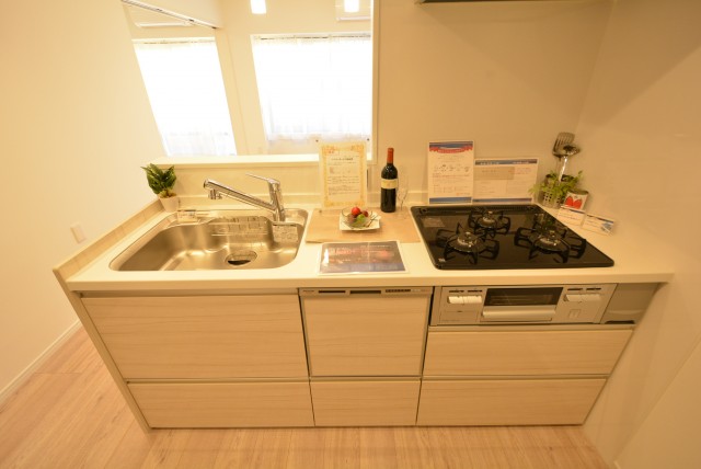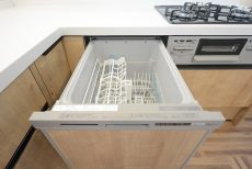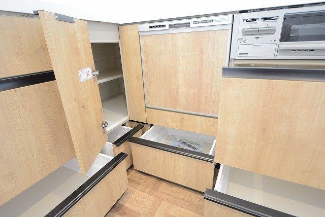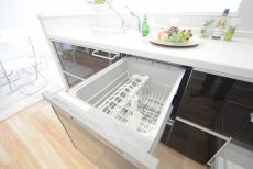 解放感がありコミュニケーションが取りやすいのが人気の理由!夕食の支度をしながらご家族の話に耳を傾けたり、お茶の準備をしながらご友人の会話の輪に加わったりと、リビングダイニングとの一体感が抜群のキッチンです。背面には揃いのカップボードが造り付けになっていて収納、作業スペース共に豊富。食器洗浄乾燥機や浄水機能一体型水栓などの便利機能も充実しています。