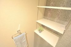 トイレのおむかえに洗濯機置き場があります。上には棚もありこちらに洗剤や洗剤のストック分も置けそうです。