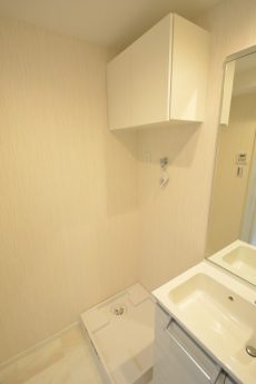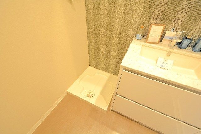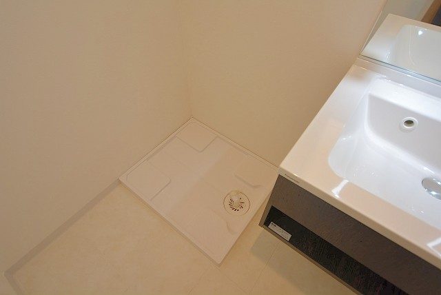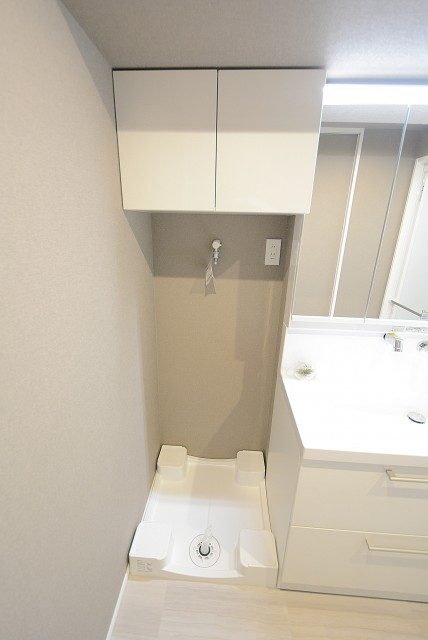 洗濯機置き場です。洗剤などは洗面台下部に仕舞って置くと出し入れしやすいですね!