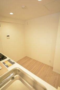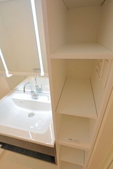 キッチン横にあるサニタリールームです。左から収納棚+洗面化粧台、右側には洗濯機置き場、バスルームとなっています。