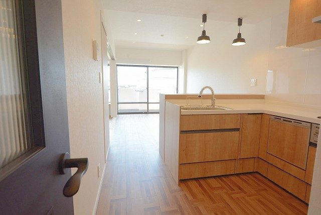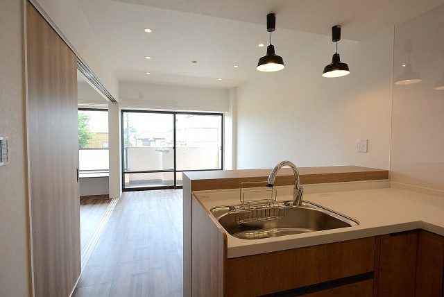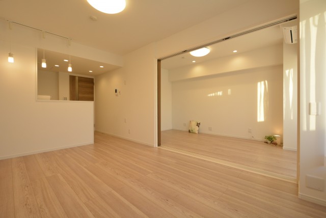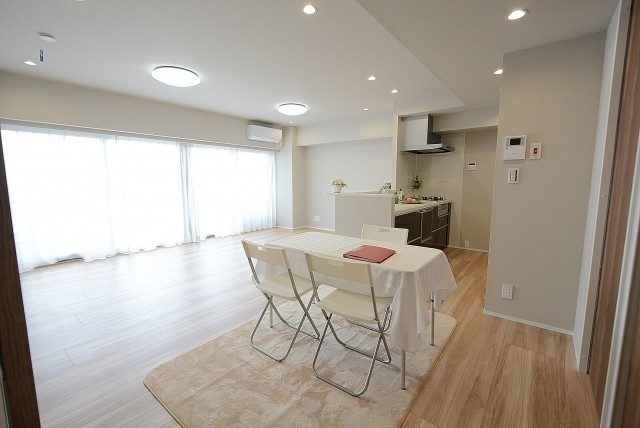 13.0帖のリビング・ダイニング・キッチン(LDK)です。左側の洋室の3枚の引戸をあけますと、より開放感がでます。