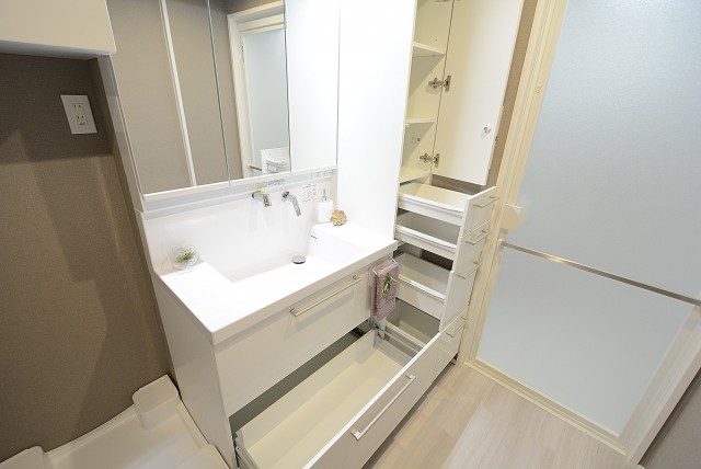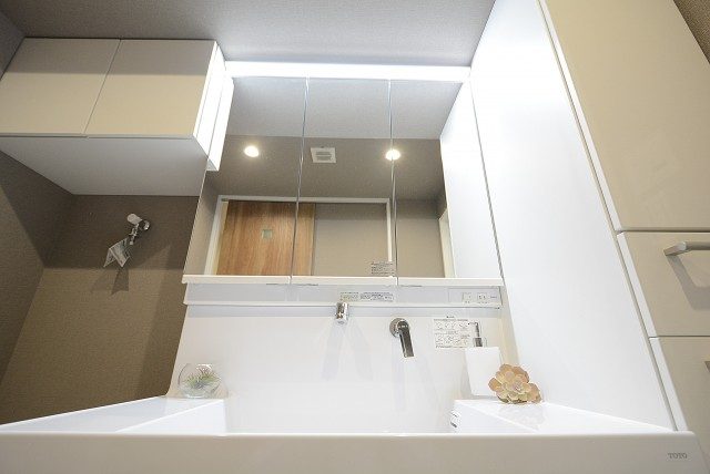洗面化粧台です。大きく見やすい三面鏡で朝のヘアースタイルにメイクにと準備はバッチリですね。ミラーをあけると裏にはもちろん収納◎化粧水やヘアースプレーなどを並べて置けそうです。