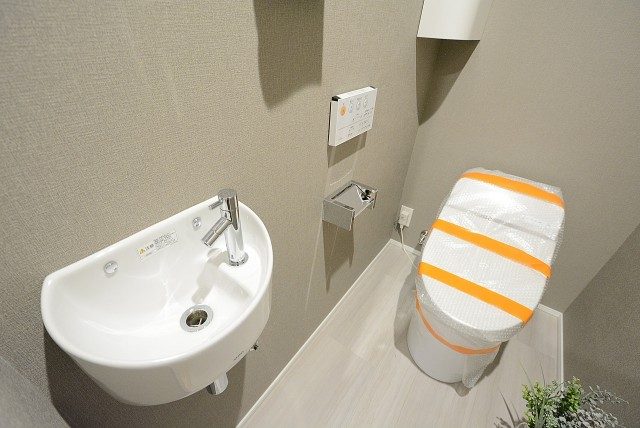 玄関入り右手にあるウォシュレット付トイレです。オシャレな手洗い付きです。ミラーもあり、お客様が見えてちょっとメイクもなおせたりと嬉しいですよね!洗面台下部は収納です。