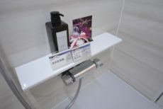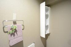 右側にはタオル等をストックしておけそうな棚が。中に浴室乾燥のスイッチが隠れているので間違えて押さないようにしてください( ・`ω・´)