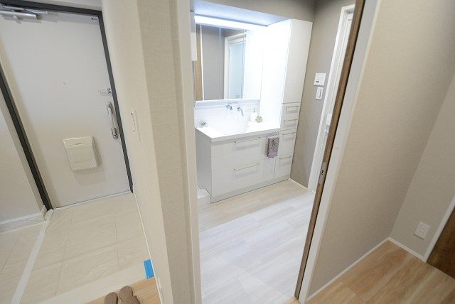 サニタリールームです。左側が浴室 正面に洗面化粧台です。