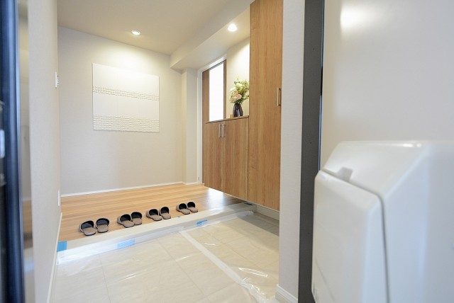 玄関を開けますとゆとりあるスペースです。右手にはシューズインクローゼットがあります。