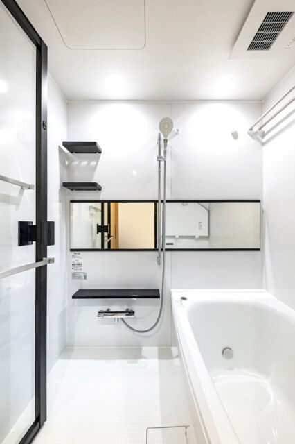 浴室は白をベースに黒のアクセントを散らした明るい雰囲気。