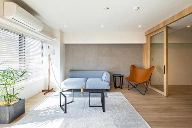 アクセントウォールはコーディネートの邪魔にならないグレー系をチョイス。