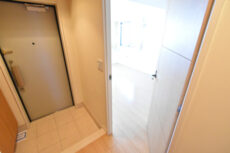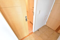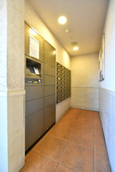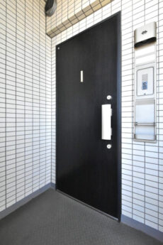 最初の扉を入ると風除室になっています。屋外の冷気や熱気の流入を防いだり、埃などでエントランスホール内が汚れるのを防いだりする効果があるんですよ。オートロックが完備されているので誰でも入れるのはここまでです。