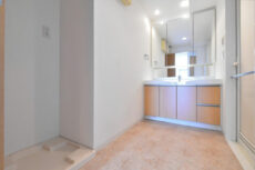 洗面化粧台は幅が広く二人くらいなら十分並んで使えそう。朝の込み合う時間帯には有難いですよね。身だしなみを整えるのに便利な三面鏡やミドルミラーも付いています。ミドルミラーは小さなお子様でも使いやすく、歯磨きを習慣付けるのにも役立つそうですよ。