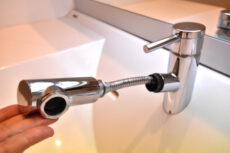 水栓はハンドシャワータイプ。ヘッドが引き出せるのでボウルを流したり、簡単な寝ぐせを直したりに便利です。三面鏡裏のキャビネットをはじめ収納も豊富。様々なタイプがあって大きなものから細かいものまでスッキリ収まりそうですね。