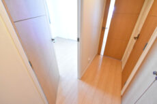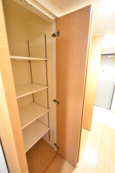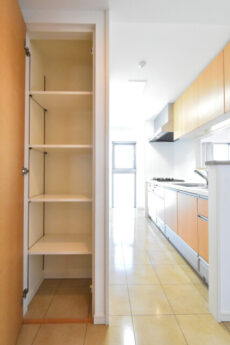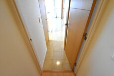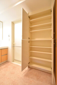 廊下には収納棚が二つ並んでいます。奥行もあって、細長いものなら棚の手前に入れることもできそうですよ。思い切って棚を全部外すなんてのもアリかもしれませんね。