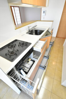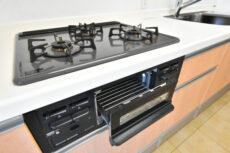 コンロは3口、グリル付。グリルってお掃除が面倒であまり使わない方も多いと思いますが、そんな方にお勧めなので「グリラー」です。蓋の付いた陶器皿のようなもので、これを使うとグリルがほぼ汚れないとか。グリルだけでなく電子レンジや直火でも使える点も秀逸です!水栓は浄水機能一体型。気軽に美味しいお水を使えますよ。