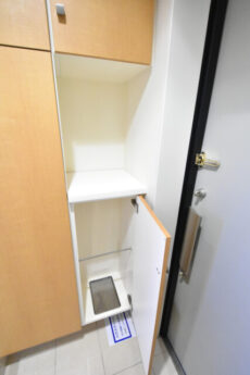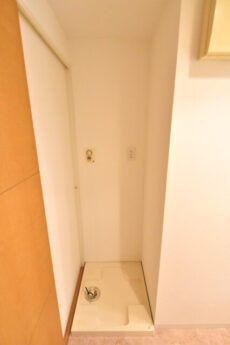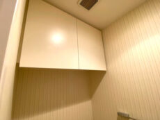 洗濯機スペースにはランドリーグッズを収納するところがありませんので、ご自身で棚を付けるか、後ろのリネン庫の一部を使うことになりそうです。ただし、棚を付けようとするとサイドに扉がくるので定番の突っ張り棚は使えず、自立式のラックタイプもスペース的に難しいので、少々工夫が必要になります。