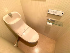 トイレはLIXIL製洗浄機能一体型。トイレットペーパーのストックや掃除道具を入れておくのに便利な吊戸棚も付いています。