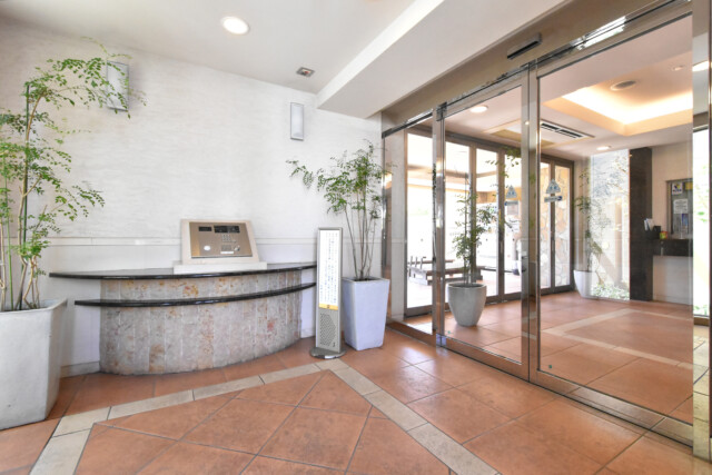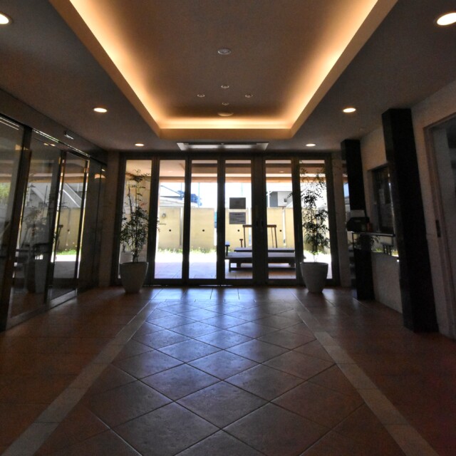 オートロックを抜けたところです。タイル貼りのフロアや、たくさんの窓から見える外の眩しさが南欧をイメージさせますね♪