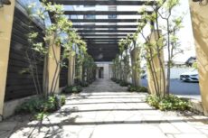 洒落た門扉から、石が敷き詰められたパーゴラの下を通ってエントランスへ向かいます。日本だと藤棚が一般的ですがパーゴラとは元々ブドウ棚のこと。ブドウの飾りが付いているしデザインした方はワイン好き?とも思いましたが、近くにブドウ園があるのが関係しているのかもしれませんね。ブドウ狩りなども楽しめるようですよ。