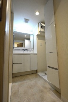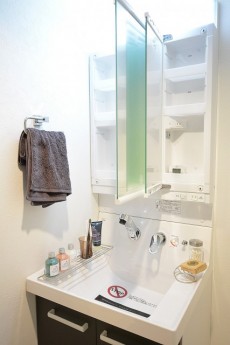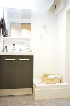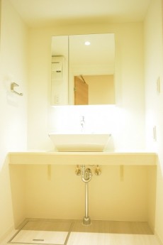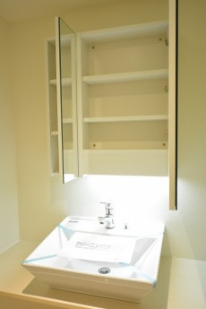 洗面化粧台の鏡の裏は収納になっており、ハブラシやコスメなどゴチャゴチャしがちなアイテムもスッキリ収納いただけます。おとなりは洗濯機置場。