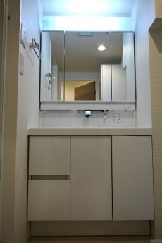 洗面室には洗面化粧台の他に洗濯機スペースと浴室がまとまっていて脱衣室も兼ねています。洗面化粧台は身だしなみチェックに便利な三面鏡付き。鏡の間に照明が付いているので影になることもありません。裏はキャビネットになっているので、洗面周りに散らかりがちな細々したものもスッキリと片付けることができますよ。