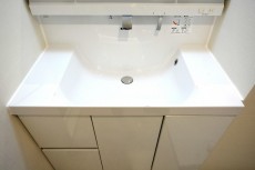 玄関ホールすぐの右側に白基調の清潔感のあるサニタリールーム。