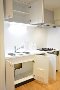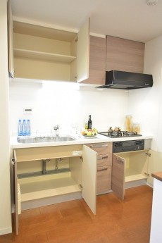 キッチンは上下に収納もたっぷり!大きなお鍋やザルもすっぽり仕舞っておけそうですね。細々したキッチングッズは引き出しの中へ入れておく感じでしょうか。