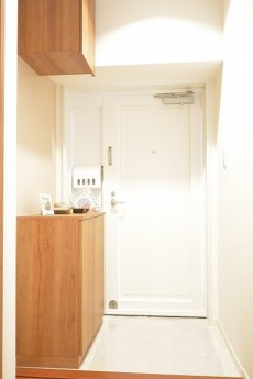 白基調の明るい玄関ホール。上下に分かれたシューズBOXが設置されています。