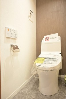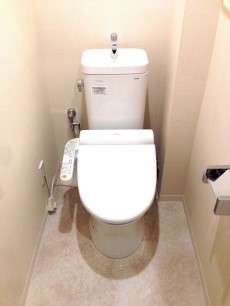 その隣にウォシュレットトイレ。収納が無いので、お隣の収納スペースに。